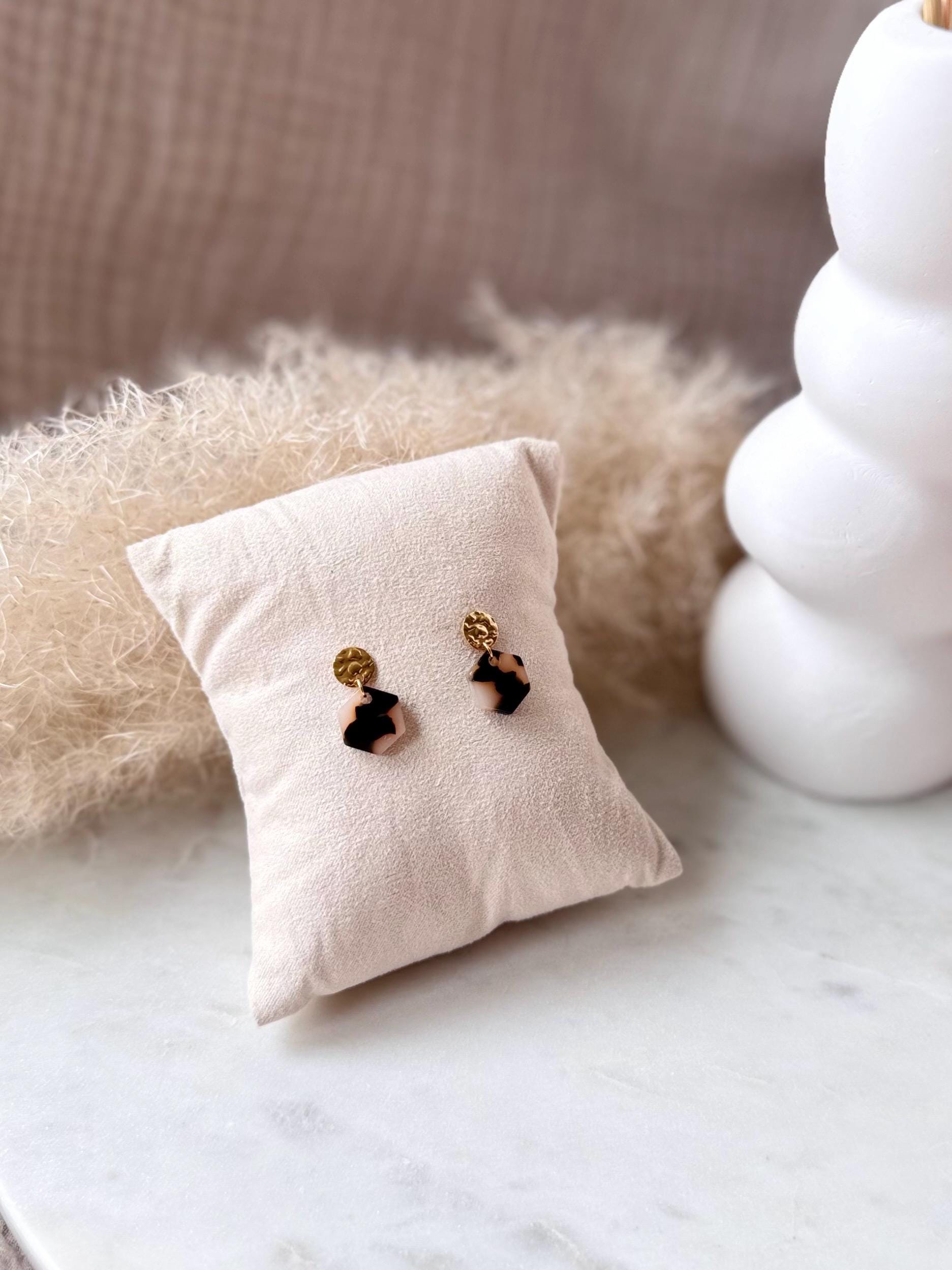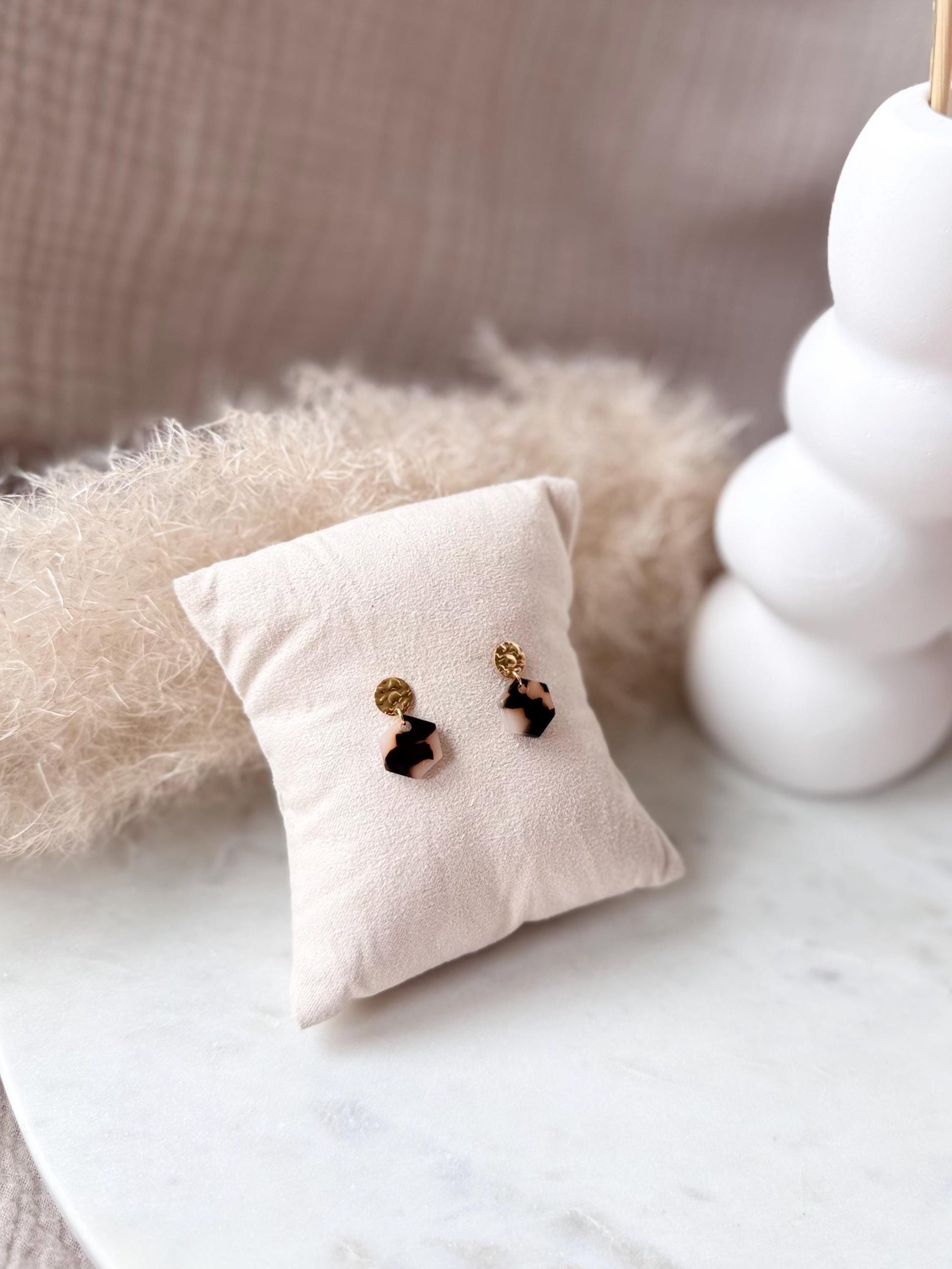 Vergoldete Edelstahl Ohrringe mit Resin Anhänger in Hexagonform - Handgefertigt