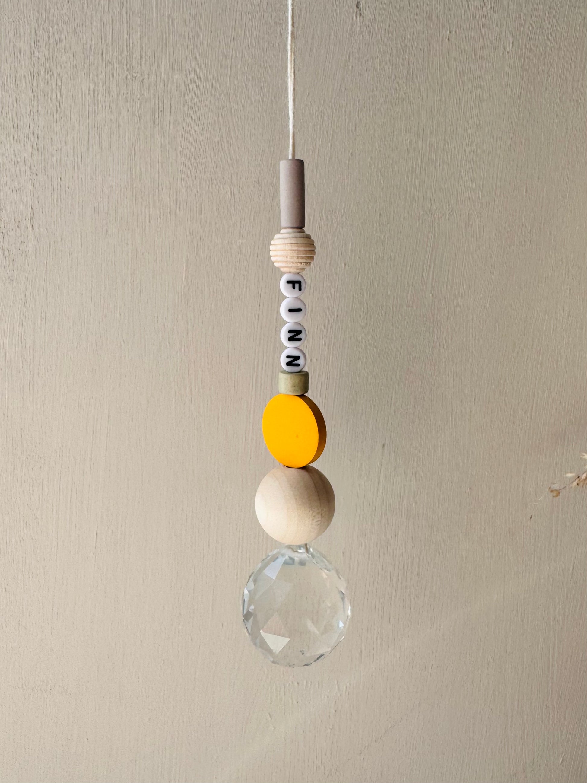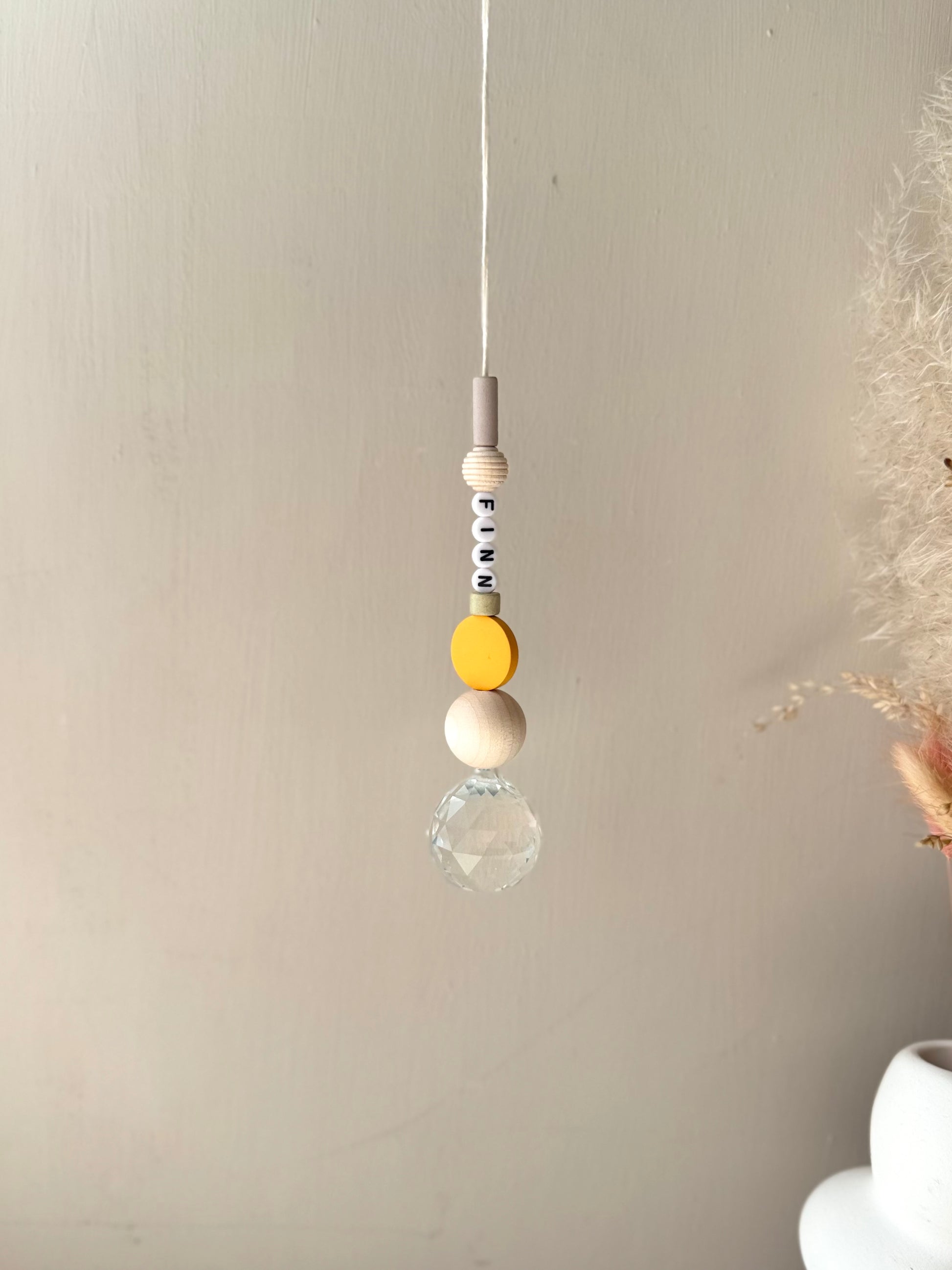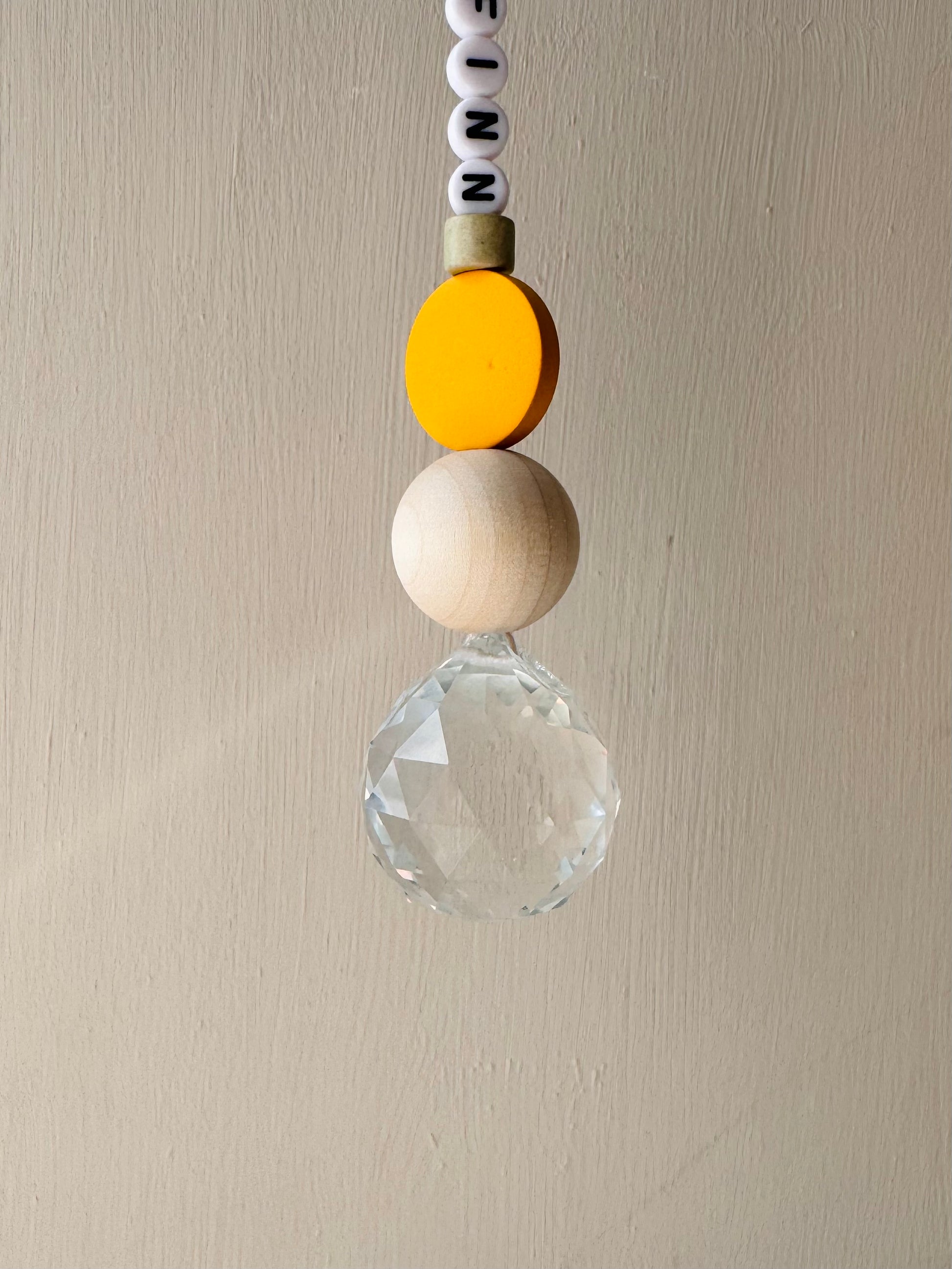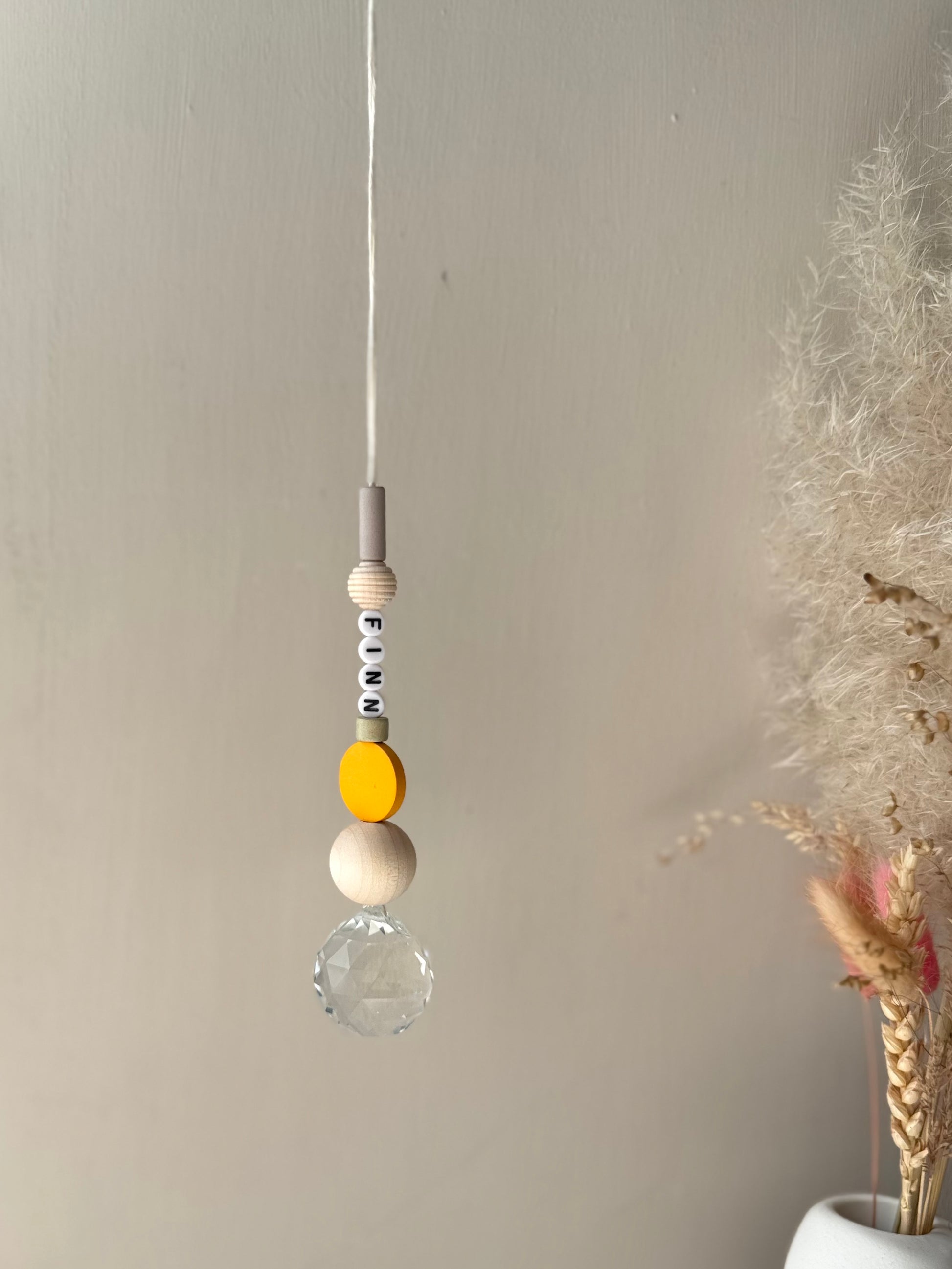 Jeder Sonnenfänger wird mit größter Sorgfalt und Liebe zum Detail handgefertigt. Die Kombination aus echtem Glaskristall, Acryl Buchstabenperlen, Keramikperlen und natürlichen Holzperlen macht jeden Sonnenfänger zu einem einzigartigen Unikat.