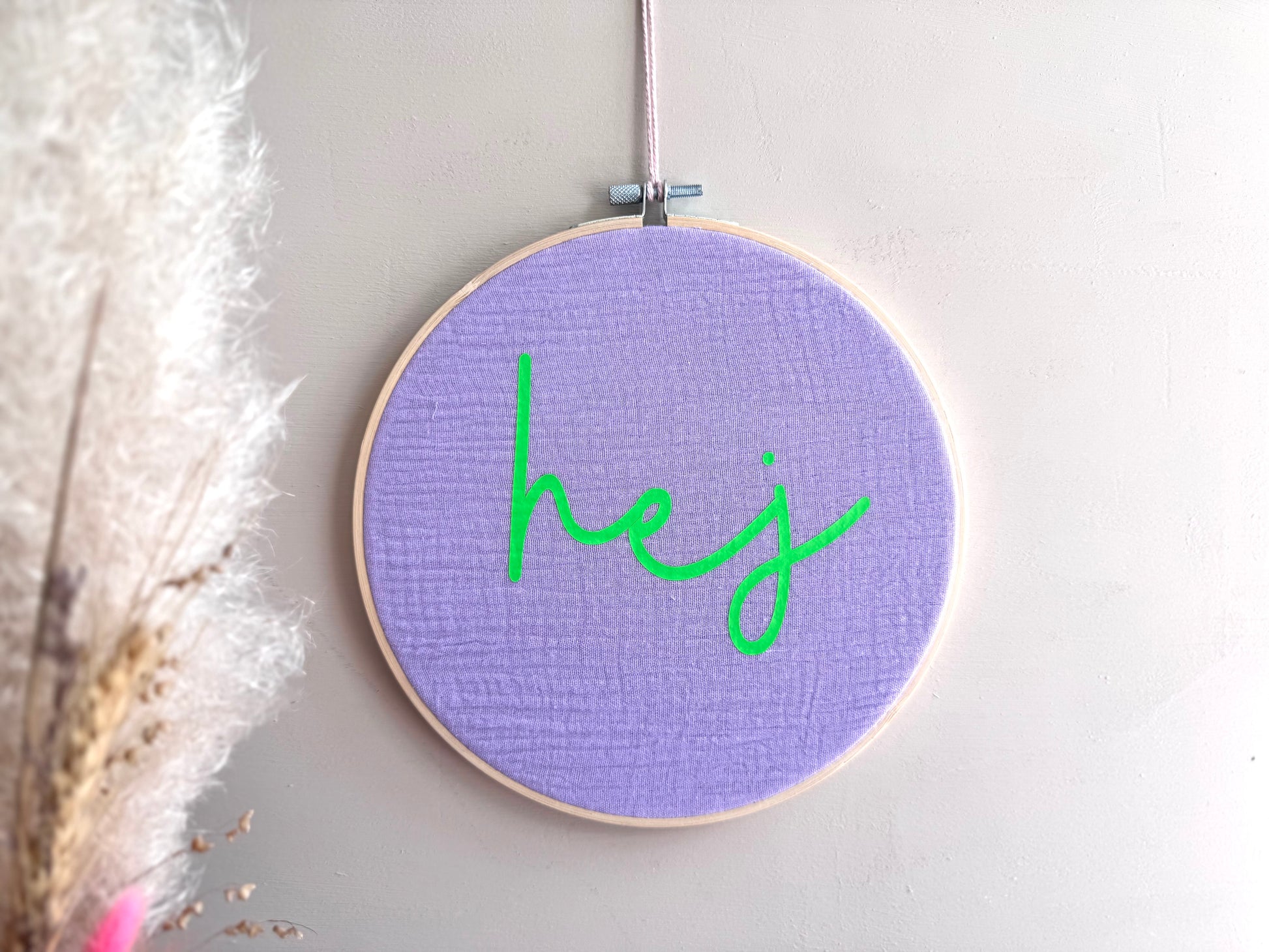 Bringe Sommervibes in dein Zuhause! Dieser wunderschöne handgefertigte Stickrahmen mit dem fröhlichen Schriftzug "hej" in leuchtendem Neongrün ist die perfekte Sommerdeko für deine vier Wände. Der zarte Musselinstoff in Flieder verleiht jedem Raum eine warme, einladende Atmosphäre.