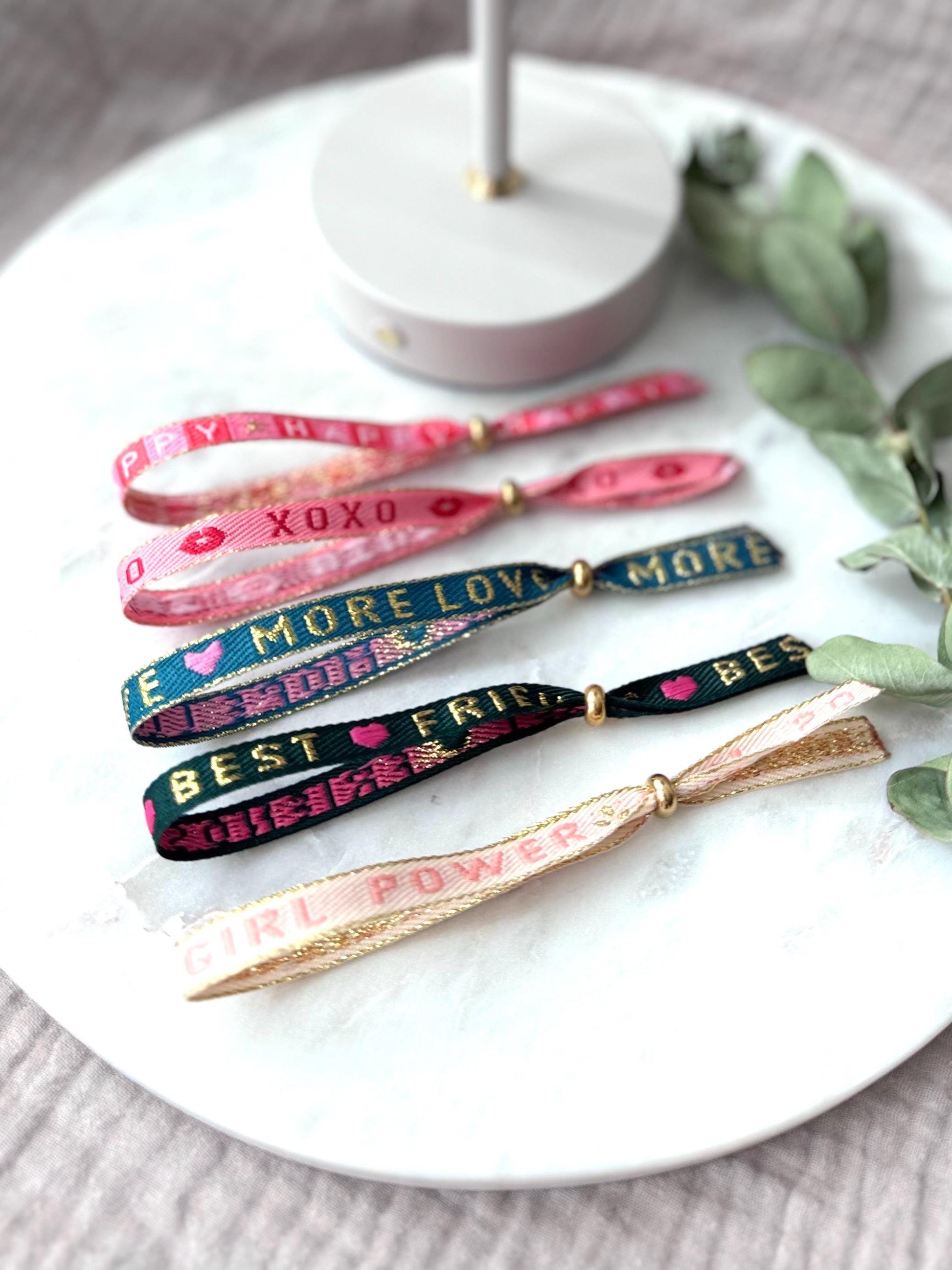 Dieses wunderschöne verstellbare Textarmband aus hochwertigem Stoffband mit goldener Stoppperle ist das perfekte Freundschaftsarmband und Accessoire für jeden Anlass. Die leuchtenden Farben und schönen Sprüche machen es zu einem echten Hingucker!