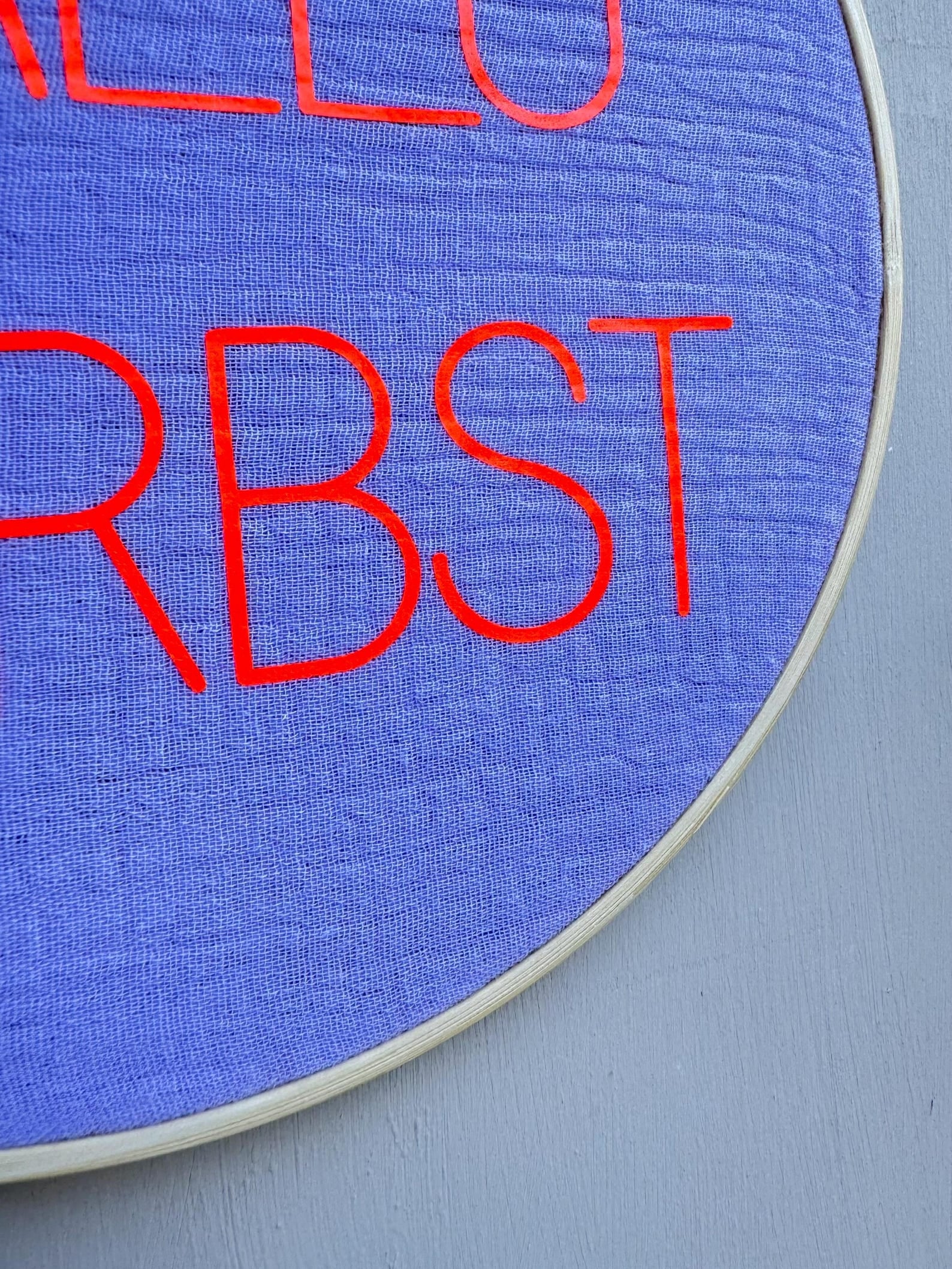 Dieser wunderschöne handgefertigte Stickrahmen mit dem herzlichen Schriftzug "Hallo Herbst" in knalligen Neonorange ist die perfekte Herbstdeko für dein Zuhause. Der schöne Musselinstoff in Flieder bringt die farbliche Herbststimmung direkt in deine vier Wände.