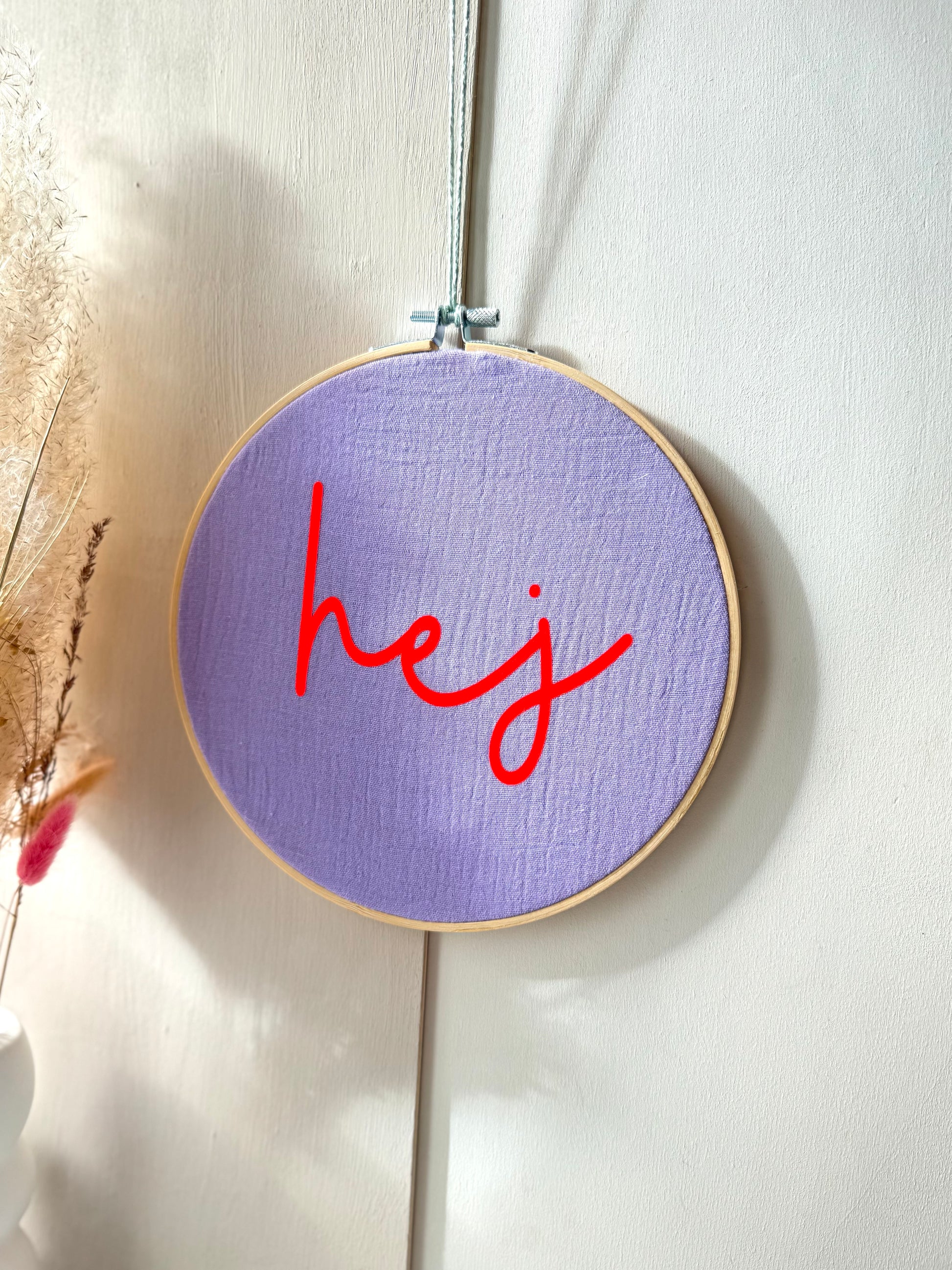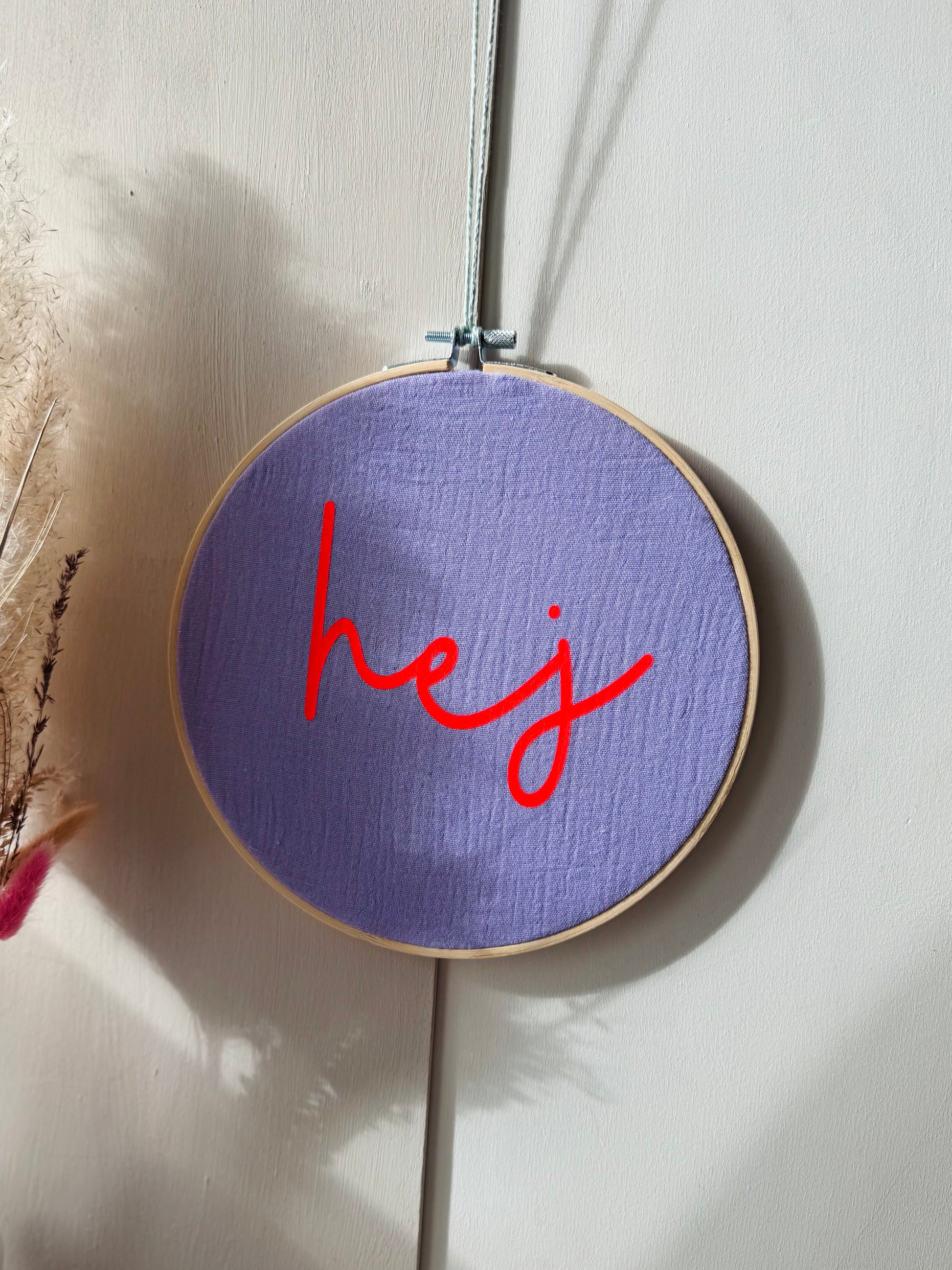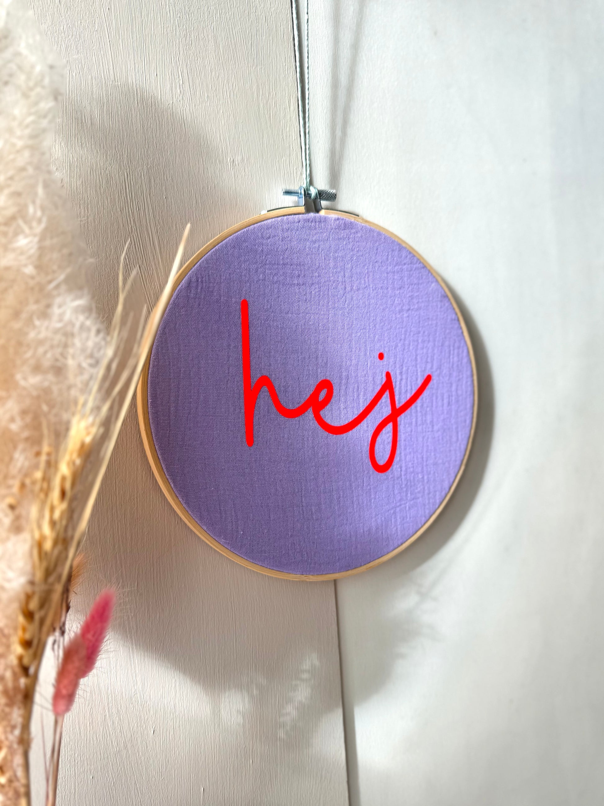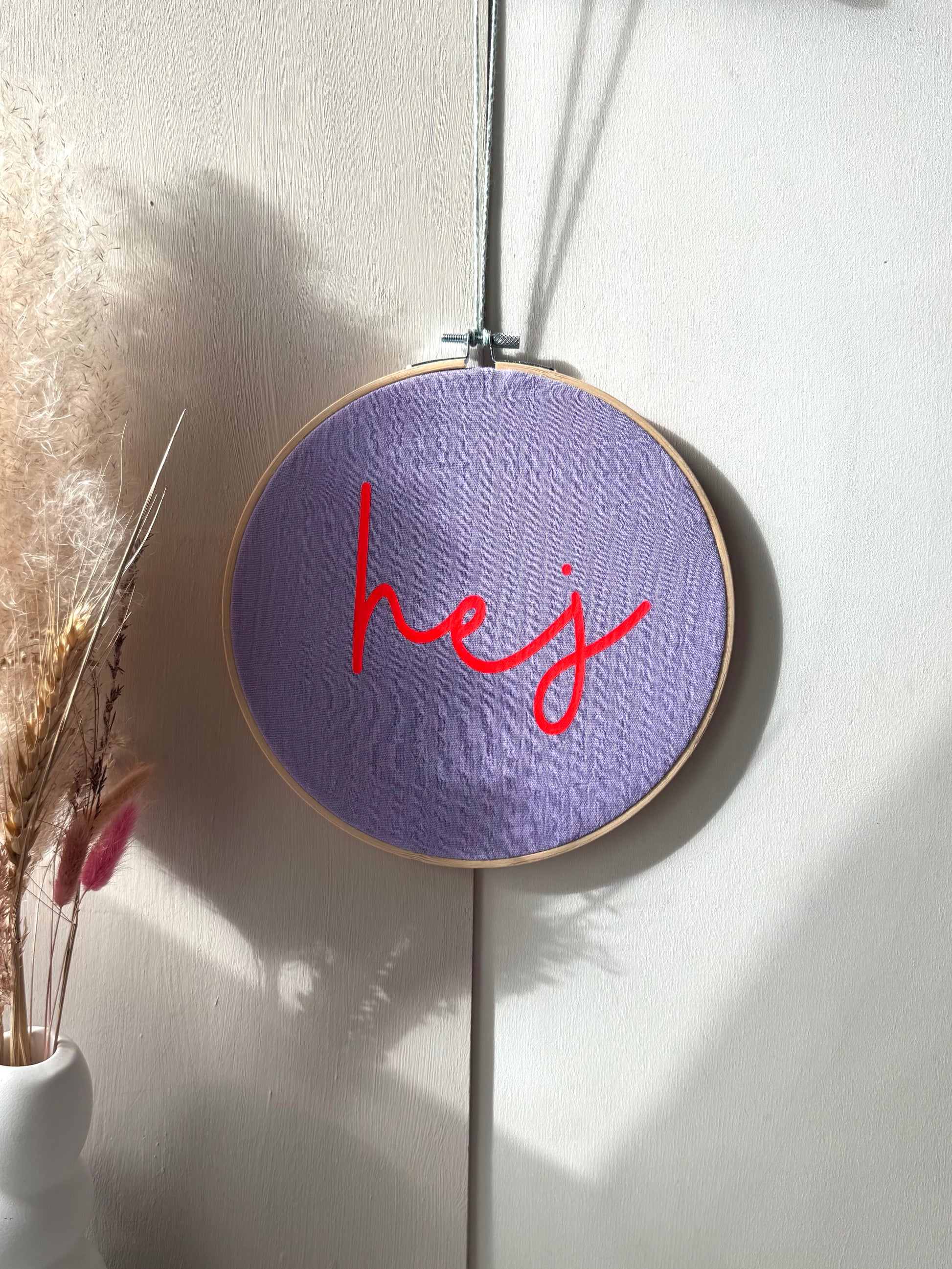 Bringe Sommervibes in dein Zuhause! Dieser wunderschöne handgefertigte Stickrahmen mit dem fröhlichen Schriftzug "hej" in leuchtendem Neonorange ist die perfekte Sommerdeko für deine vier Wände. Der zarte Musselinstoff in Flieder verleiht jedem Raum eine warme, einladende Atmosphäre.
