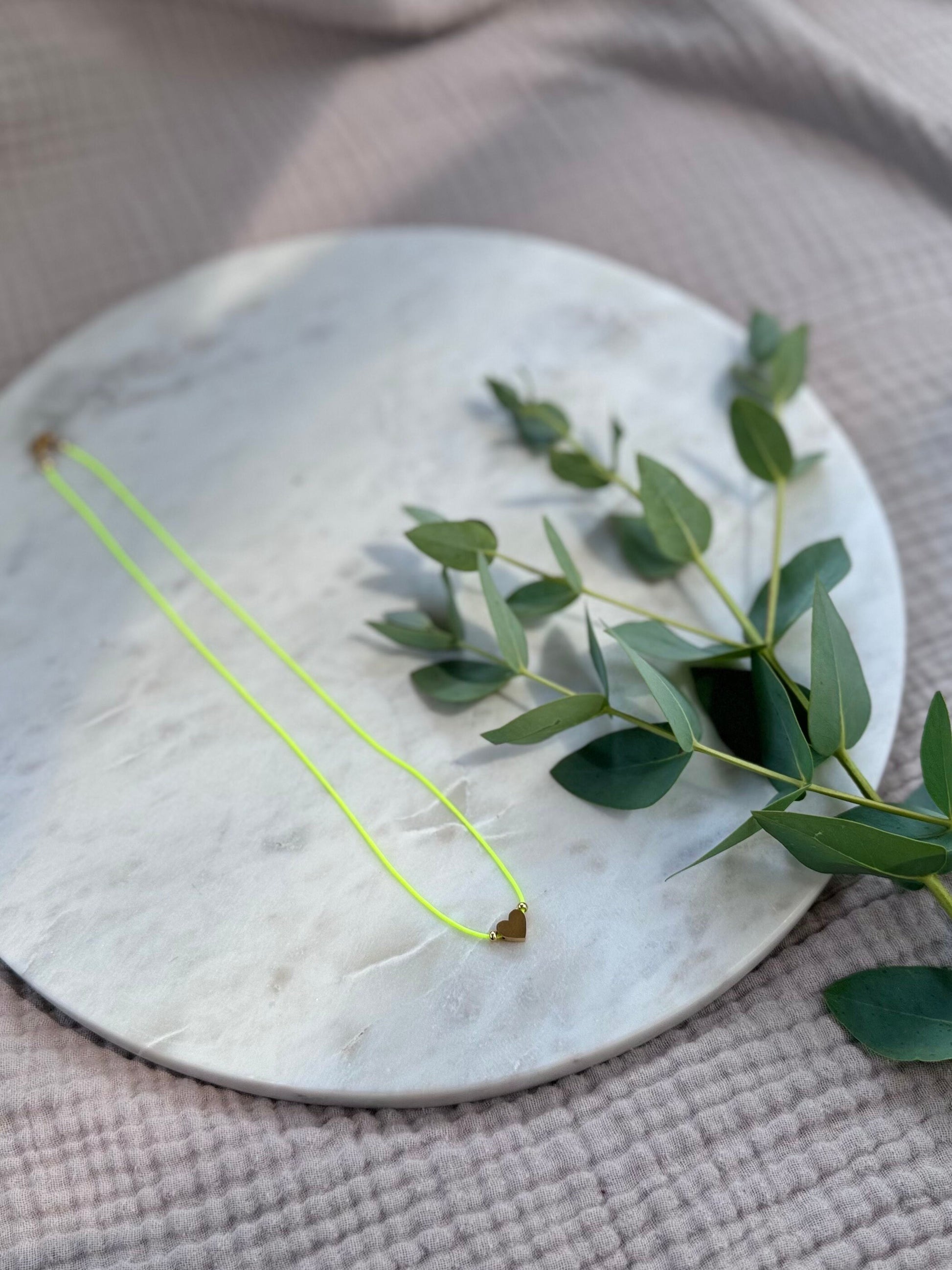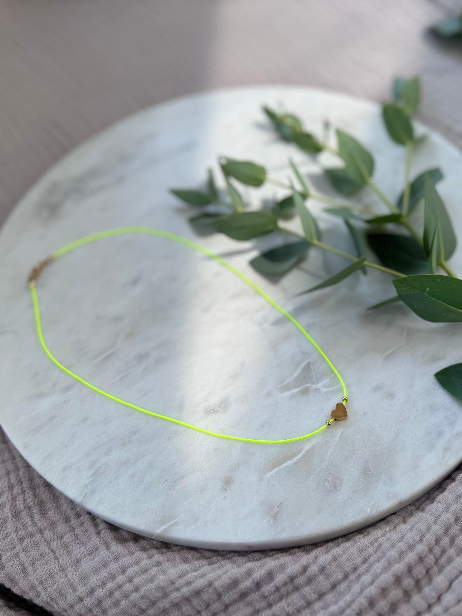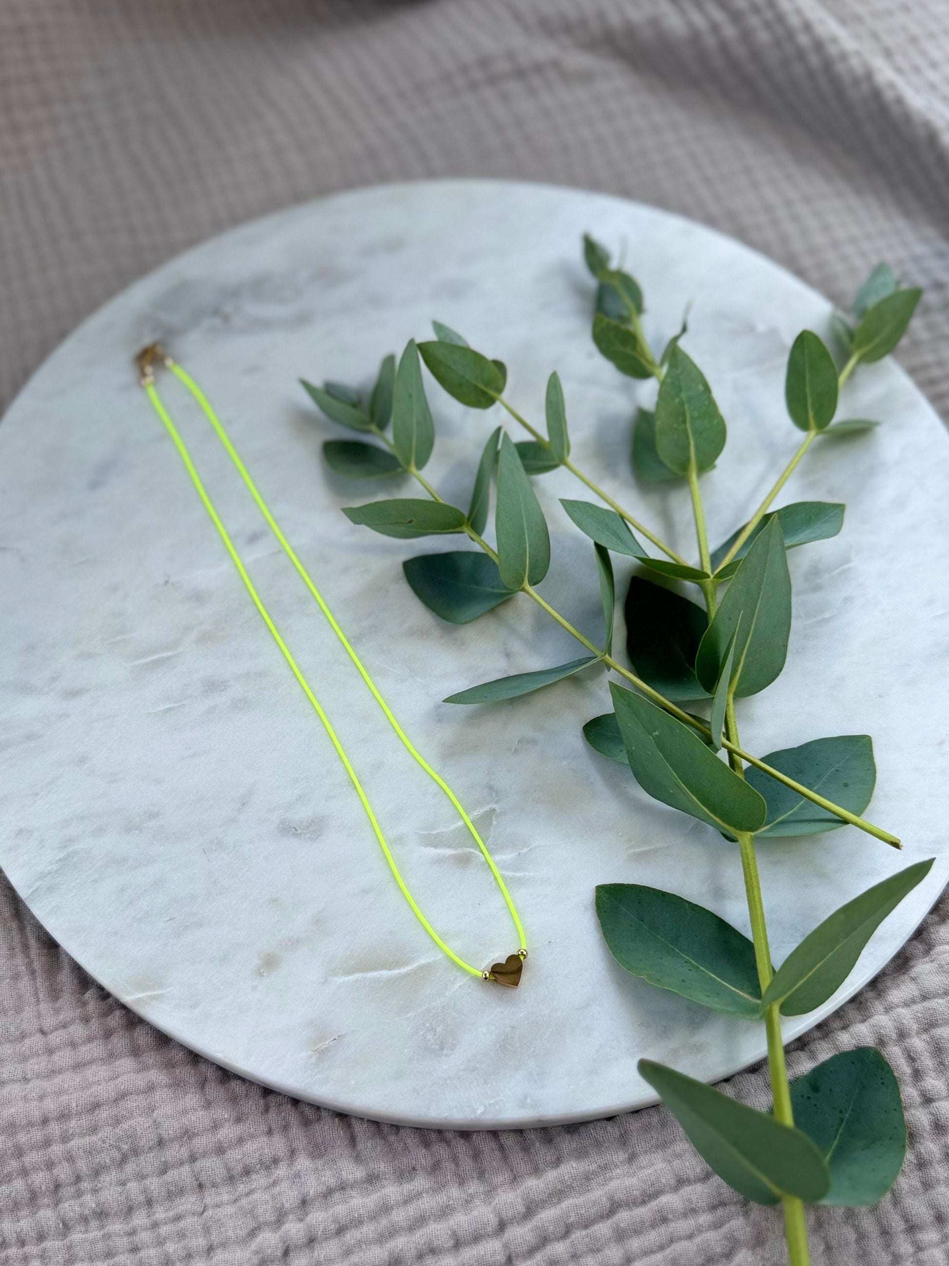 Verleihe deinem Look das gewisse Etwas! Diese wunderschöne handgefertigte Kette aus hochwertigem Polyesterband in leuchtendem Neongelb mit vergoldetem Edelstahl-Herzanhänger ist das perfekte Accessoire für jeden Anlass. Der zeitlose Ibiza-Style macht sie zum absoluten Must-Have für modebewusste Frauen.